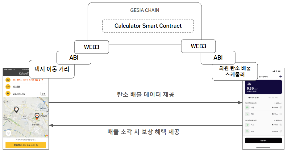 <figure><img src="https://179079823-files.gitbook.io/~/files/v0/b/gitbook-x-prod.appspot.com/o/spaces%2FuSTsQQAPLsSkraKd9zX0%2Fuploads%2FwTVJ46vpEvMO5k2kC7hV%2Fimage.png?alt=media&#x26;token=1a75d637-80db-4be3-a7a8-7e4f55f37775" alt="" width="563"><figcaption><p>[ ABI를 활용한 탄소 배출 계산기 스마트컨트랙트 ]</p></figcaption></figure>